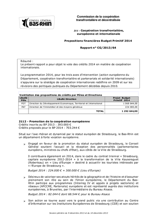 Le présent rapport a pour objet le vote des crédits 2014 en matière de coopération internationale. La programmation 2014, pour les trois axes d'intervention (action européenne du Département, coopération transfrontalière et partenariats et solidarité internationale) s'appuiera sur la stratégie de coopération internationale redéfinie en 2009 et sur les révisions des politiques publiques du Département décidées depuis 2010.