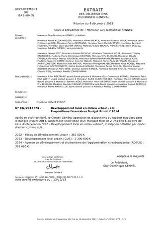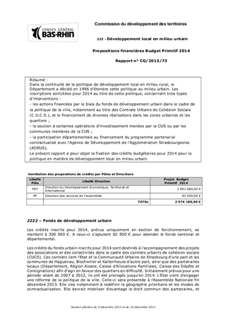 Dans la continuité de la politique de développement local en milieu rural, le Département a décidé en 1996 d'étendre cette politique au milieu urbain. Les inscriptions sollicitées pour 2014 au titre de cette politique, concernent trois types d'interventions : - les actions financées par le biais du fonds de développement urbain dans le cadre de la politique de la ville, notamment au titre des Contrats Urbains de Cohésion Sociale (C.U.C.S.), et le financement de diverses réalisations dans les zones urbaines et les quartiers ; - le soutien à certaines opérations d'investissement menées par la CUS ou par les communes membres de la CUS ; - la participation départementale au financement du programme partenarial contractualisé avec l'Agence de Développement de l'Agglomération Strasbourgeoise (ADEUS). Le présent rapport a pour objet la fixation des crédits budgétaires pour 2014 pour la politique en matière de développement local en milieu urbain.