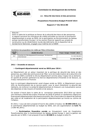 Dans le cadre de la politique en faveur de la sécurité des biens et des personnes, le rapport concerne les inscriptions de crédits sollicitées au titre de la contribution départementale à verser au SDIS, de la participation au fonctionnement du bateau pompe transfrontalier Europa 1 et du soutien financier apporté aux projets de construction ou de réhabilitation lourde des bâtiments mis à disposition de la Gendarmerie Nationale, engagés sous maîtrise de la SIBAR