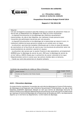 Cet axe correspond à plusieurs activités relatives aux actions de prévention mises en oeuvre par le Département sur délégation de l'Etat ou à titre volontariste : - le dispositif de prévention et de dépistage des infections sexuellement transmissibles, du sida et des hépatites, qui s'adresse à toute personne pour l'ensemble des pathologies transmises par voie sexuelle, - le dispositif de prévention et de dépistage de la tuberculose qui assure le suivi, le traitement médical de toute personne malade ou en contact avec ce risque, - la prévention vaccinale des maladies infectieuses par la mise en place de séances de vaccinations et la fourniture de vaccins pour les structures de prévention selon les recommandations du calendrier vaccinal en vigueur, - la prévention des cancers par le soutien financier à des associations, principalement ADEMAS pour le dépistage du cancer du sein, EVE pour le dépistage du cancer du col de l'utérus, ADECA Alsace pour la prévention du cancer colorectal et la Ligue Départementale contre le cancer pour ses actions menées dans ce domaine, - l'accès aux soins des personnes en situation précaire.