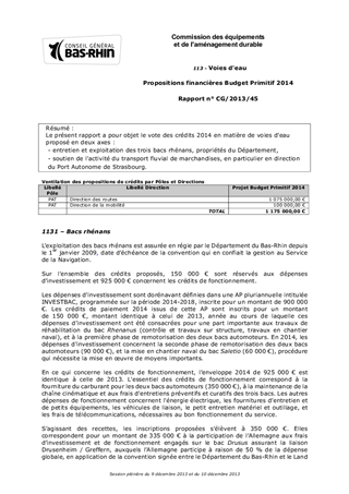 Le présent rapport a pour objet le vote des crédits 2014 en matière de voies d'eau proposé en deux axes : - entretien et exploitation des trois bacs rhénans, propriétés du Département, - soutien de l'activité du transport fluvial de marchandises, en particulier en direction du Port Autonome de Strasbourg.