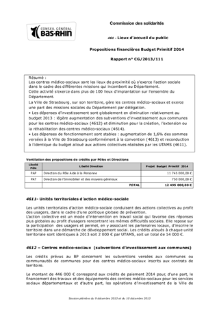 Les centres médico-sociaux sont les lieux de proximité où s'exerce l'action sociale dans le cadre des différentes missions qui incombent au Département. Cette activité s'exerce dans plus de 100 lieux d'implantation sur l'ensemble du Département. La Ville de Strasbourg, sur son territoire, gère les centres médico-sociaux et exerce une part des missions sociales du Département par délégation. • Les dépenses d'investissement sont globalement en diminution relativement au budget 2013 : légère augmentation des subventions d'investissement aux communes pour les centres médico-sociaux (4612) et diminution pour la création, l'extension ou la réhabilitation des centres médico-sociaux (4614). • Les dépenses de fonctionnement sont stables : augmentation de 1,6% des sommes versées à la Ville de Strasbourg conformément à la convention (4613) et reconduction à l'identique du budget alloué aux actions collectives réalisées par les UTAMS (4611).