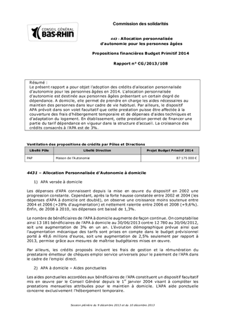 Le présent rapport a pour objet l'adoption des crédits d'allocation personnalisée d'autonomie pour les personnes âgées en 2014. L'allocation personnalisée d'autonomie est destinée aux personnes âgées présentant un certain degré de dépendance. A domicile, elle permet de prendre en charge les aides nécessaires au maintien des personnes dans leur cadre de vie habituel. Par ailleurs, le dispositif APA prévoit dans son volet facultatif que cette prestation puisse être affectée à la couverture des frais d'hébergement temporaire et de dépenses d'aides techniques et d'adaptation du logement. En établissement, cette prestation permet de financer une partie du tarif dépendance en vigueur dans la structure d'accueil. La croissance des crédits consacrés à l'APA est de 3%.