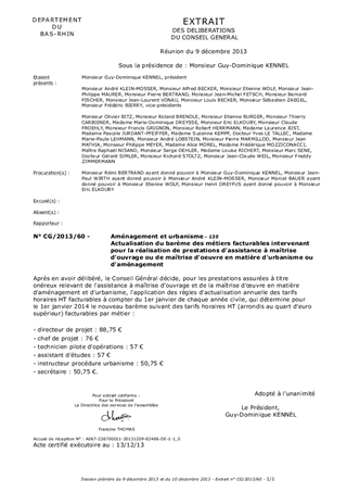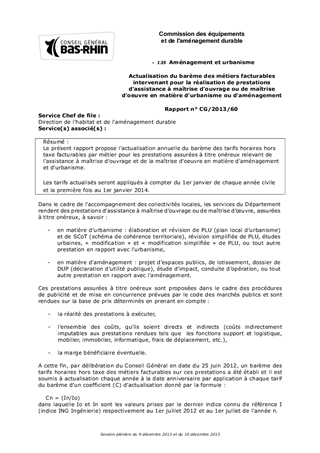 Le présent rapport propose l'actualisation annuelle du barème des tarifs horaires hors taxe facturables par métier pour les prestations assurées à titre onéreux relevant de l'assistance à maîtrise d'ouvrage et de la maîtrise d'oeuvre en matière d'aménagement et d'urbanisme. Les tarifs actualisés seront appliqués à compter du 1er janvier de chaque année civile et la première fois au 1er janvier 2014.