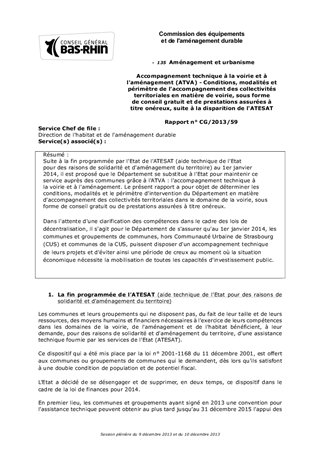 Suite à la fin programmée par l'Etat de l'ATESAT (aide technique de l'Etat pour des raisons de solidarité et d'aménagement du territoire) au 1er janvier 2014, il est proposé que le Département se substitue à l'Etat pour maintenir ce service auprès des communes grâce à l'ATVA : l'accompagnement technique à la voirie et à l'aménagement. Le présent rapport a pour objet de déterminer les conditions, modalités et le périmètre d'intervention du Département en matière d'accompagnement des collectivités territoriales dans le domaine de la voirie, sous forme de conseil gratuit ou de prestations assurées à titre onéreux. Dans l'attente d'une clarification des compétences dans le cadre des lois de décentralisation, il s'agit pour le Département de s'assurer qu'au 1er janvier 2014, les communes et groupements de communes, hors Communauté Urbaine de Strasbourg (CUS) et communes de la CUS, puissent disposer d'un accompagnement technique de leurs projets et d'éviter ainsi une période de creux au moment où la situation économique nécessite la mobilisation de toutes les capacités d'investissement public.