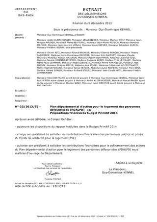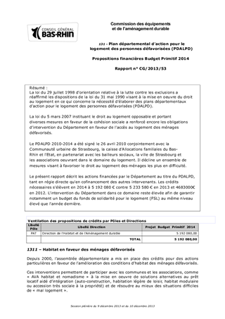 La loi du 29 juillet 1998 d'orientation relative à la lutte contre les exclusions a réaffirmé les dispositions de la loi du 31 mai 1990 visant à la mise en oeuvre du droit au logement en ce qui concerne la nécessité d'élaborer des plans départementaux d'action pour le logement des personnes défavorisées (PDALPD). La loi du 5 mars 2007 instituant le droit au logement opposable et portant diverses mesures en faveur de la cohésion sociale a renforcé encore les obligations d'intervention du Département en faveur de l'accès au logement des ménages défavorisés. Le PDALPD 2010-2014 a été signé le 26 avril 2010 conjointement avec la Communauté urbaine de Strasbourg, la caisse d'Allocations familiales du Bas-Rhin et l'Etat, en partenariat avec les bailleurs sociaux, la ville de Strasbourg et les associations oeuvrant dans le domaine du logement. Il décline un ensemble de mesures visant à favoriser le droit au logement des ménages les plus en difficulté. Le présent rapport décrit les actions financées par le Département au titre du PDALPD, tant en régie directe qu'en cofinancement des autres intervenants. Les crédits nécessaires s'élèvent en 2014 à 5 192 080 € contre 5 233 580 € en 2013 et 4683000€ en 2012. L'intervention du Département dans ce domaine reste élevée afin de garantir notamment un budget du fonds de solidarité pour le logement (FSL) au même niveau élevé que l'année dernière.