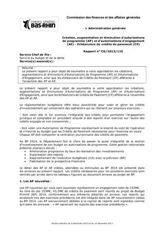 Le présent rapport a pour objet de soumettre à votre approbation les créations, augmentations et diminutions d'Autorisations de Programme (AP) et d'Autorisations d'Engagement, ainsi que les échéanciers de Crédits de Paiement (CP) afférents à l'ensemble des AP et AE.