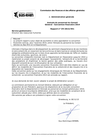 Le présent rapport a pour objet de soumettre à votre approbation la convention financière conclue, pour l'exercice 2014, entre l'Amicale du personnel du Conseil Général du Bas-Rhin et le Département.