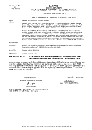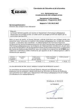 Le Conseil Général apporte son soutien à l'équipement informatique pédagogique réalisé dans les collèges privés. Le crédit inscrit au budget primitif est réparti par la commission permanente.
