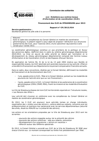 Dans le cadre des compétences du Conseil Général en matière de coordination gérontologique, le présent rapport a pour objet de proposer l'attribution aux structures gestionnaires des CLIC, pour l'exercice 2013, d'une subvention équivalente à celle versée pour l'année 2012.