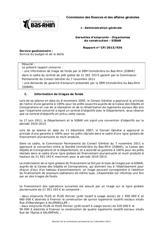 Le présent rapport concerne : - une information de tirage de fonds par la SEM Immobilière du Bas-Rhin (SIBAR) dans le cadre du contrat de prêt global de 21 551 193 € garanti par la Commission Permanente du Conseil Général du 7 novembre 2011 - une demande de garantie d'emprunt présentée par la SEM Immobilière du Bas-Rhin (SIBAR).
