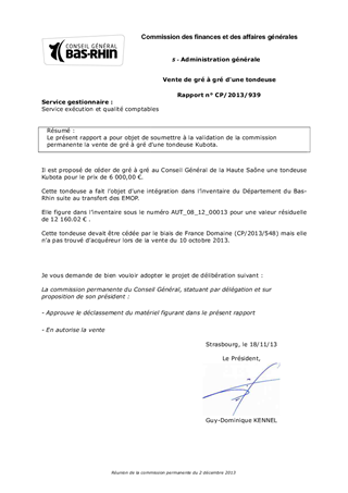 Le présent rapport a pour objet de soumettre à la validation de la commission permanente la vente de gré à gré d'une tondeuse Kubota.