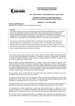 Le présent rapport concerne la demande d'aide financière présentée par un particulier au titre de l'accession sociale à la propriété, dans le cadre de l'ancien dispositif de soutien départemental au Pass-Foncier, mis en place par délibération du Conseil Général du 23 mars 2009. Ce particulier avait obtenu le 7 juin 2010 une subvention de 4 000 € qui a fait l'objet d'une déchéance, faute de sollicitation du versement. Par courrier en date du 9 octobre 2013, ce ménage a fait part des difficultés qu'il a rencontrées dans la réalisation de son projet, à savoir la disparition de l'entreprise maître d'oeuvre en plein milieu de la réalisation des travaux. Cette situation ne lui a pas permis de demander le versement de cette subvention dans les délais. Il demande donc le rétablissement de la subvention initiale.