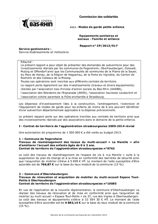 Le présent rapport a pour objet de présenter des demandes de subventions pour des investissements réalisés par les communes de Fegersheim, Oberhausbergen, Ostwald, Mutzig et Offendorf ainsi que les Communautés de communes de la Plaine de la Sauer, du Pays de Hanau, de la Région de Haguenau, de la Porte du Vignoble, du Canton de Rosheim et des Coteaux de la Mossig. Toutes ces opérations sont inscrites aux différents contrats de territoire. Le rapport porte également sur des investissements (travaux et divers équipements) réalisés par l'association bas-rhinoise d'action sociale du Bas-Rhin (AASBR), l'association des Résidents de l'Esplanade (ARES), l'association Jeunesse Loubavitch et l'association crèche parentale la Flûte enchantée à Strasbourg.