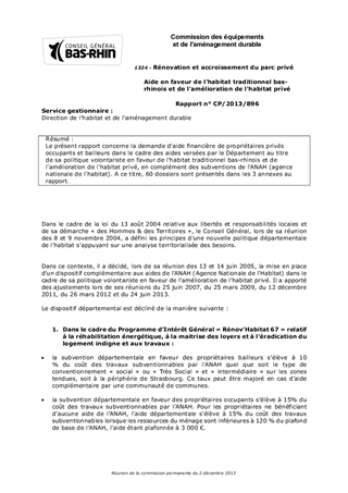 Le présent rapport concerne la demande d'aide financière de propriétaires privés occupants et bailleurs dans le cadre des aides versées par le Département au titre de sa politique volontariste en faveur de l'habitat traditionnel bas-rhinois et de l'amélioration de l'habitat privé, en complément des subventions de l'ANAH (agence nationale de l'habitat). A ce titre, 60 dossiers sont présentés dans les 3 annexes au rapport.