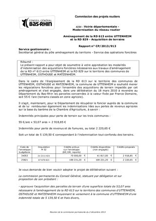 Le présent rapport a pour objet de soumettre à votre approbation les modalités d'indemnisation des acquisitions foncières nécessaires aux travaux d'aménagement de la RD n° 613 entre UTTENHEIM et la RD 829 sur le territoire des communes de UTTENHEIM, OSTHOUSE et MATZENHEIM.