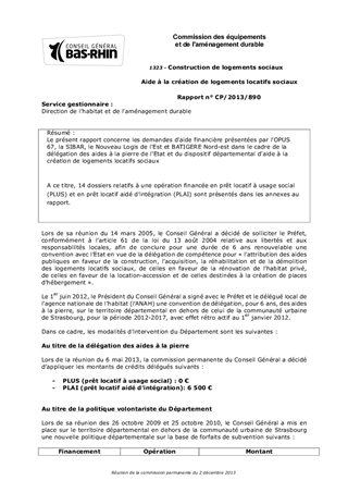 Le présent rapport concerne les demandes d'aide financière présentées par l'OPUS 67, la SIBAR, le Nouveau Logis de l'Est et BATIGERE Nord-est dans le cadre de la délégation des aides à la pierre de l'Etat et du dispositif départemental d'aide à la création de logements locatifs sociaux A ce titre, 14 dossiers relatifs à une opération financée en prêt locatif à usage social (PLUS) et en prêt locatif aidé d'intégration (PLAI) sont présentés dans les annexes au rapport.