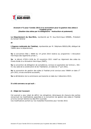 Avenant n° 2 à la convention 2013 de gestion pour l'habitat privé des aides déléguées de l'ANAH