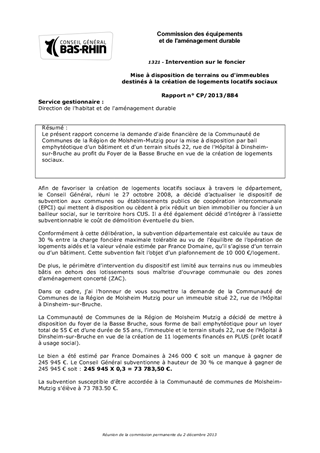 Le présent rapport concerne la demande d'aide financière de la Communauté de Communes de la Région de Molsheim-Mutzig pour la mise à disposition par bail emphytéotique d'un bâtiment et d'un terrain situés 22, rue de l'Hôpital à Dinsheim-sur-Bruche au profit du Foyer de la Basse Bruche en vue de la création de logements sociaux.
