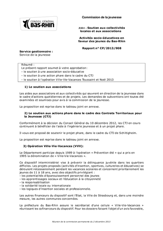 Le présent rapport soumet à votre approbation: - le soutien à une association socio-éducative - le soutien à une action phare dans le cadre du CTJ - le soutien à l'opération Ville-Vie-Vacances Toussaint et Noël 2013