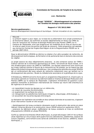 Le présent rapport a pour objet, sur la base de la présentation d'un projet architectural et fonctionnel abouti, de confirmer le soutien départemental en faveur du CNRS au titre de l'extension de l'Institut de Biologie Moléculaire des Plantes (IBMP) sur le Campus de l'Esplanade, ainsi que d'approuver les modalités de sa mise en oeuvre par la mise en place d'une convention de fonds de concours. Cette proposition est adossée aux termes du Contrat de Projets Etat-Région et de la Programmation FEDER sur la période 2007-2013.
