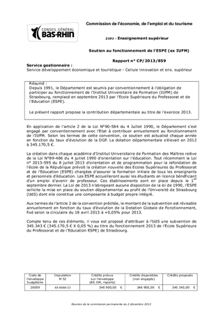 Depuis 1991, le Département est soumis par conventionnement à l'obligation de participer au fonctionnement de l'Institut Universitaire de Formation (IUFM) de Strasbourg, remplacé en septembre 2013 par l'Ecole Supérieure du Professorat et de l'Education (ESPE). Le présent rapport propose la contribution départementale au titre de l'exercice 2013.