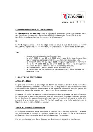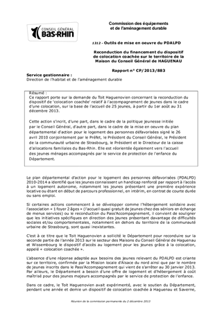 Ce rapport porte sur la demande du Toit Haguenovien concernant la reconduction du dispositif de 'colocation coachée' relatif à l'accompagnement de jeunes dans le cadre d'une colocation, sur la base de l'accueil de 25 jeunes, à partir du 1er août au 31 décembre 2013. Cette action s'incrit, d'une part, dans le cadre de la politique jeunesse initiée par le Conseil Général, d'autre part, dans le cadre de la mise en oeuvre du plan départemental d'action pour le logement des personnes défavorisées signé le 26 avril 2010 conjointement par le Préfet, le Président du Conseil Général, le Président de la communauté urbaine de Strasbourg, le Président et le Directeur de la caisse d'allocations familiales du Bas-Rhin. Elle est réorientée également vers l'accueil des jeunes ménages accompagnés par le service de protection de l'enfance du Département.