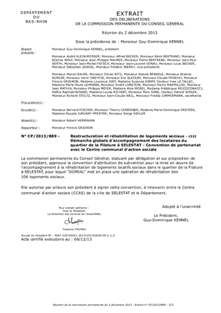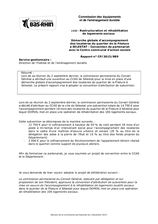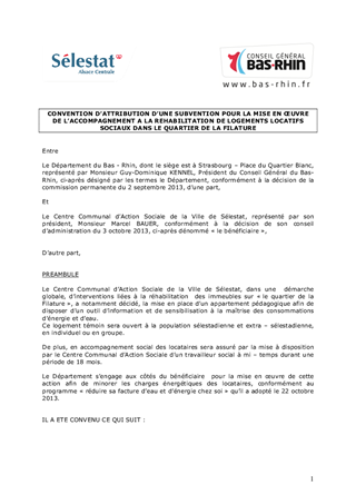 Lors de sa réunion du 2 septembre dernier, la commission permanente du Conseil Général a attribué une suvention au CCAS de Sélestat pour la mise en place d'une démarche globale d'accompagnement des locataires du quartier de la Filature à Sélestat. Le présent rapport vise à adopter la convention d'attribution de subvention.