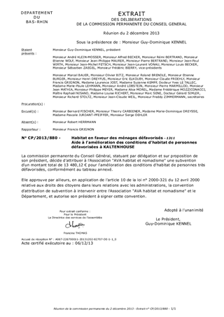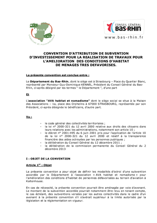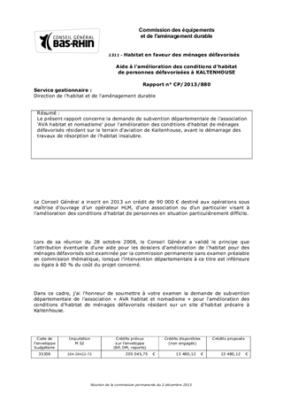 Le présent rapport concerne la demande de subvention départementale de l'association 'AVA habitat et nomadisme' pour l'amélioration des conditions d'habitat de ménages défavorisés résidant sur le terrain d'aviation de Kaltenhouse, avant le démarrage des travaux de résorption de l'habitat insalubre.