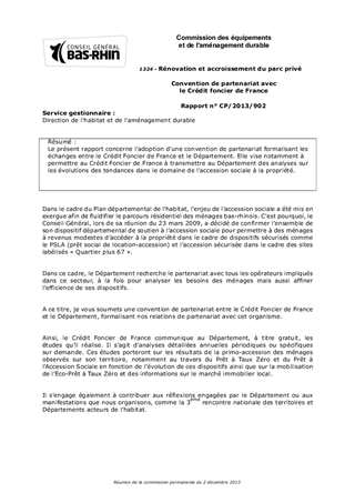 Le présent rapport concerne l'adoption d'une convention de partenariat formalisant les échanges entre le Crédit Foncier de France et le Département. Elle vise notamment à permettre au Crédit Foncier de France à transmettre au Département des analyses sur les évolutions des tendances dans le domaine de l'accession sociale à la propriété.
