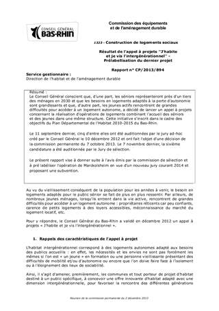 Le Conseil Général conscient que, d'une part, les séniors représenteront près d'un tiers des ménages en 2030 et que les besoins en logements adaptés à la perte d'autonomie sont grandissants et que, d'autre part, les jeunes actifs rencontrent de grandes difficultés pour accéder à un logement autonome, a décidé de lancer un appel à projets concernant la réalisation d'opérations de logements combinant l'accueil des séniors et des jeunes dans une même structure. Cette initiative s'inscrit dans le cadre des objectifs du Plan Départemental de l'Habitat 2010-2015 du Bas-Rhin. Le 11 septembre dernier, cinq d'entre elles ont été auditionnées par le jury ad-hoc créé par le Conseil Général le 10 décembre 2012 et ont fait l'objet d'une décision de la commission permanente du 7 octobre 2013. Le 7 novembre dernier, la sixième candidature a été auditionnée par le Jury de sélection. Le présent rapport vise à donner suite à l'avis émis par la commission de sélection et à pré labéliser l'opération de Marckolsheim en vue d'un nouveau jury courant 2014 et proposant une subvention.