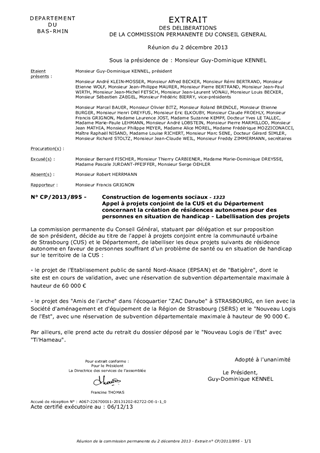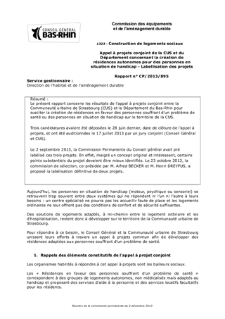 Le présent rapport concerne les résultats de l'appel à projets conjoint entre la Communauté urbaine de Strasbourg (CUS) et le Département du Bas-Rhin pour susciter la création de résidences en faveur des personnes souffrant d'un problème de santé ou des personnes en situation de handicap sur le territoire de la CUS. Trois candidatures avaient été déposées le 28 juin dernier, date de clôture de l'appel à projets, et ont été auditionnées le 17 juillet 2013 par un jury conjoint (Conseil Général et CUS). Le 2 septembre 2013, la Commission Permanente du Conseil général avait pré labélisé ces trois projets. En effet, malgré un concept original et intéressant, certains points substantiels du projet devaient être mieux identifiés. Le 23 octobre 2013, la commission de sélection, co-présidée par M. Alfred BECKER et M. Henri DREYFUS, a proposé la labélisation définitive de deux projets.