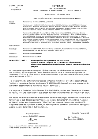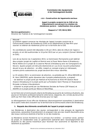 Le présent rapport concerne les résultats de l'appel à projets conjoint de la Communauté urbaine de Strasbourg (CUS) et du Département du Bas-Rhin pour susciter la création de résidences junior sur le territoire de la CUS. Six candidatures avaient été déposées le 28 juin 2013, date de clôture de l'appel à projets, et ont été auditionnées le 16 juillet 2013 par un jury conjoint (Conseil Général et CUS). Lors de sa réunion du 2 septembre 2013, la Commission Permanente avait labélisé deux projets (projet de LogiEst et Domial avec le Foyer Notre-Dame à Strasbourg - Maille Athéna et le projet de la caserne Marcot à Strasbourg avec les Compagnons du Devoir). Quatre projets ont été prés électionnés en vue d'une nouvelle présentation devant le jury de sélection : en effet, malgré un concept original et intéressant, certains points substantiels du projet devaient être mieux identifiés. Le 23 octobre 2013, la commission de sélection, co-présidée par M. Alfred BECKER et M. Henri DREYFUS, après réexamen des 4 projets présélectionnés, a proposé : - de labéliser le projet porté par Habitat et Humanisme et AIVS HH Gestion Nord-Alsace à Strasbourg et le projet porté par La Fondation Saint Thomas et l'Association Entraide Le Relais à Mundolsheim - d'écarter le projet porté par Les Résidences Sociales de France (I3F Alsace) et ADOMA et le projet porté par Néolia et Résid'Etap.