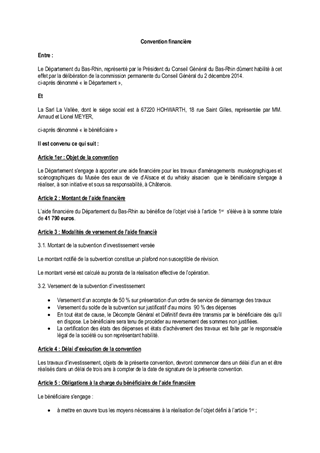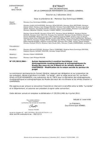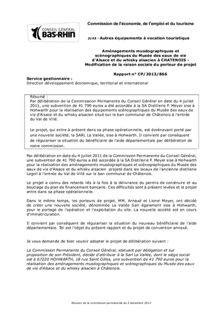 Par délibération de la Commisssion Permanente du Conseil Général en date du 4 juillet 2011, une subvention de 41 790 euros a été accordée à la SA Distillerie F. Meyer sise à Hohwarth pour la réalisation des équipements scénographiques du Musée des eaux de vie d'Alsace et du whisky alsacien situé sur le ban communal de Châtenois à l'entrée du Val de Villé. Le projet, qui entre à présent dans sa phase opérationnelle, est dorénavant porté par une nouvelle société, la SARL La Vallée, sise à Hohwarth. Il convient par conséquent de régulariser la situation du bénéficiaire de l'aide départementale par délibération de notre commission.