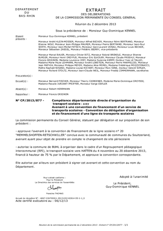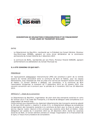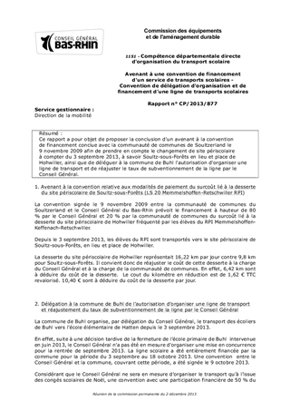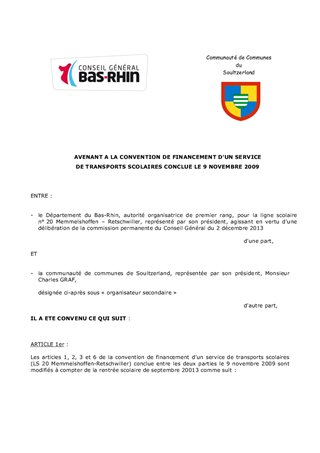 Ce rapport a pour objet de proposer la conclusion d'un avenant à la convention de financement conclue avec la communauté de communes de Soultzerland le 9 novembre 2009 afin de prendre en compte le changement de site périscolaire à compter du 3 septembre 2013, à savoir Soultz-sous-Forêts en lieu et place de Hohwiller, ainsi que de déléguer à la commune de Buhl l'autorisation d'organiser une ligne de transport et de réajuster le taux de subventionnement de la ligne par le Conseil Général.