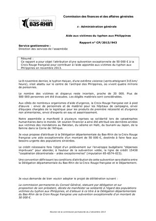 Ce rapport a pour objet l'attribution d'une subvention exceptionnelle de 50 000 € à la Croix Rouge française pour contribuer à l'aide apportée aux victimes du typhon aux Philippines en novembre 2013.