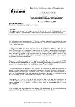 Ce rapport vise à rendre au budget annexe du Service du Parc de Véhicules et des Bacs Rhénans (SPVBR) le produit de la vente des véhicules réalisé par le budget principal.