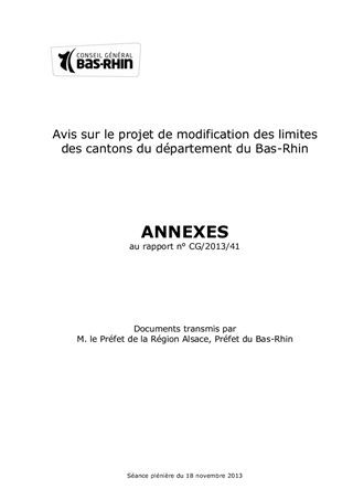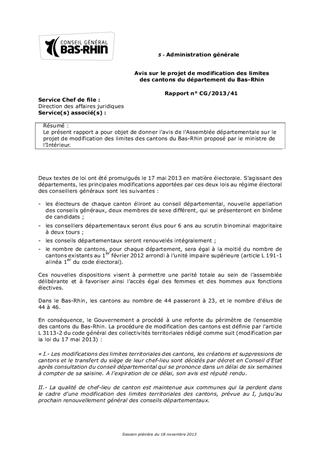 Le présent rapport a pour objet de donner l'avis de l'Assemblée départementale sur le projet de modification des limites des cantons du Bas-Rhin proposé par le ministre de l'Intérieur.