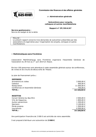 Le présent rapport concerne trois demandes de subvention présentées par des associations et organismes pour l’organisation de congrès, colloques et autres manifestations