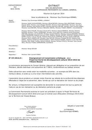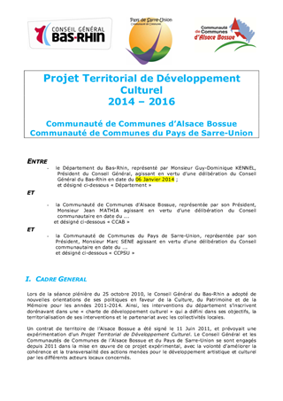 Les orientations politiques en faveur de la Culture, du Patrimoine et de la Mémoire du Conseil Général du Bas-Rhin s’inscrivent dans une charte définissant les objectifs de territorialisation de ses interventions et de partenariat avec les collectivités locales, dans un souci de proximité et d'efficacité de son action. Le contrat de territoire d'Alsace Bossue, signé le 11 Juin 2011, prévoyait une expérimentation d’un Projet Territorial de Développement Culturel. Le Conseil Général et les Communautés de Communes de l’Alsace Bossue et du Pays de Sarre-Union se sont engagés dans la mise en œuvre de ce projet avec la volonté d'améliorer la cohérence et la transversalité des actions menées pour le développement artistique et culturel par les différents acteurs locaux concernés. Le présent rapport a pour objet de soumettre à votre approbation le document cadre relatif au Projet Territorial de Développement Culturel 2014 - 2016 en partenariat avec les Communautés de Communes de l'Alsace Bossue et du Pays de Sarre-Union.