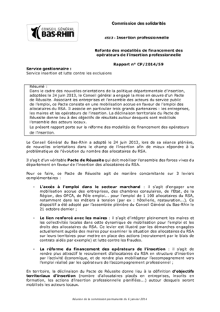 Dans le cadre des nouvelles orientations de la politique départementale d’insertion, adoptées le 24 juin 2013, le Conseil général a engagé la mise en œuvre d’un Pacte de Réussite. Associant les entreprises et l’ensemble des acteurs du service public de l’emploi, ce Pacte consiste en une mobilisation accrue en faveur de l’emploi des allocataires du RSA. Il associe en particulier trois grands partenaires : les entreprises, les maires et les opérateurs de l’insertion. La déclinaison territoriale du Pacte de Réussite donne lieu à des objectifs de résultats autour desquels sont mobilisés l’ensemble des acteurs locaux. Le présent rapport porte sur la réforme des modalités de financement des opérateurs de l’insertion.