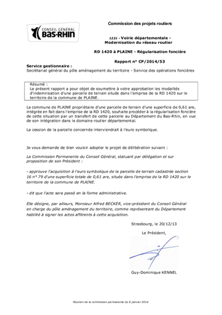 Le présent rapport a pour objet de soumettre à votre approbation les modalités d'indemnisation d'une parcelle de terrain située dans l'emprise de la RD 1420 sur le territoire de la commune de PLAINE.