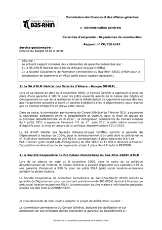 Le présent rapport concerne deux demandes de garantie présentées par : 1) la SA d’HLM Habitat des Salariés d’Alsace-Groupe DOMIAL 2) la Société Coopérative de Promotion Immobilière du Bas-Rhin-SACIC d’HLM pour la construction de logements en PSLA (prêt social location-accession).