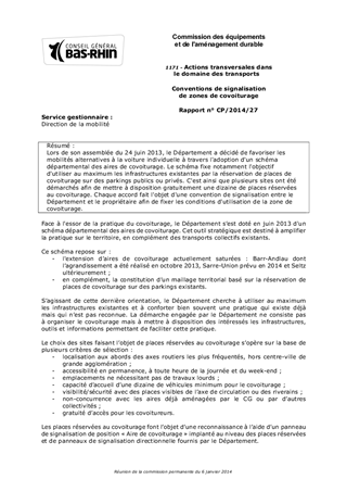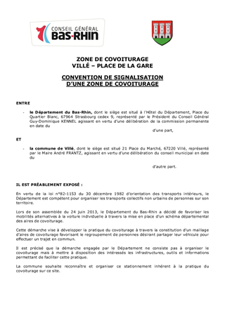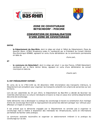 Lors de son assemblée du 24 juin 2013, le Département a décidé de favoriser les mobilités alternatives à la voiture individuelle à travers l'adoption d'un schéma départemental des aires de covoiturage. Le schéma fixe notamment l'objectif d'utiliser au maximum les infrastructures existantes par la réservation de places de covoiturage sur des parkings publics ou privés. C'est ainsi que plusieurs sites ont été démarchés afin de mettre à disposition gratuitement une dizaine de places réservées au covoiturage. Chaque accord fait l'objet d'une convention de signalisation entre le Département et le propriétaire afin de fixer les conditions d'utilisation de la zone de covoiturage.