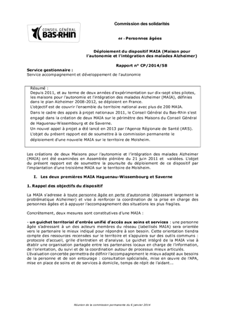 Depuis 2011, et au terme de deux années d'expérimentation sur dix-sept sites pilotes, les maisons pour l'autonomie et l'intégration des malades Alzheimer (MAIA), définies dans le plan Alzheimer 2008-2012, se déploient en France. L'objectif est de couvrir l'ensemble du territoire national avec plus de 200 MAIA. Dans le cadre des appels à projet nationaux 2011, le Conseil Général du Bas-Rhin s'est engagé dans la création de deux MAIA sur le périmètre des Maisons du Conseil Général de Haguenau-Wissembourg et de Saverne. Un nouvel appel à projet a été lancé en 2013 par l'Agence Régionale de Santé (ARS). L'objet du présent rapport est de soumettre à la commission permanente le déploiement d'une nouvelle MAIA sur le territoire de Molsheim.