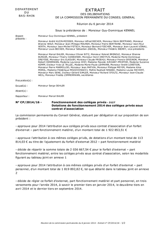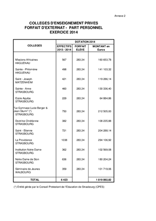 Ce rapport présente les modalités de calcul et de répartition des dotations de fonctionnement 2014 (forfait d'externat part fonctionnement matériel et part personnel) destinées aux 13 collèges privés sous contrat d’association avec l’Etat.