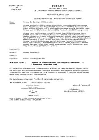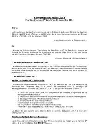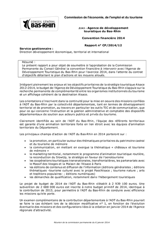 Le présent rapport a pour objet de soumettre à l'approbation de la Commission Permanente du Conseil Général la convention financière à intervenir avec l'Agence de Développement Touristique du Bas-Rhin pour l'exercice 2014, dans l'attente du contrat d'objectifs détaillant le plan d'actions et les moyens alloués.
