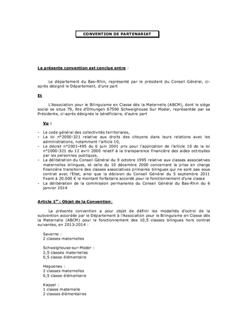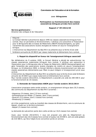Le Conseil Général subventionne depuis 1995 les classes associatives bilingues hors contrat. Pour en permettre le fonctionnement, il attribue une subvention à l'Association pour le Bilinguisme dès la Classe de Maternelle (ABCM-Zweisprachigkeit), qui gère l'ensemble des associations locales chargées de mettre en oeuvre l'enseignement bilingue. L'intervention du Département du Bas-Rhin se présente sous la forme d'une aide forfaitaire annuelle de 20 000 € par classe maternelle et élémentaire hors contrat.
