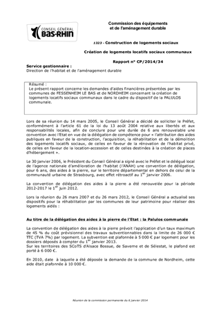 Le présent rapport concerne les demandes d’aides financières présentées par les communes de FESSENHEIM LE BAS et de NORDHEIM concernant la création de logements locatifs sociaux communaux dans le cadre du dispositif de la PALULOS communale.