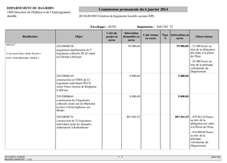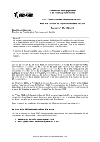 Le présent rapport concerne les demandes d’aide financière présentées par le Foyer de la Basse Bruche, OPUS 67, la Communauté de Communes Sauer-Pechelbronn et la SIBAR, dans le cadre de la délégation des aides à la pierre de l’Etat et du dispositif départemental d’aide à la création de logements locatifs sociaux. A ce titre, 8 dossiers relatifs à des opérations financées en prêt locatif à usage social (PLUS) et en prêt locatif aidé d’intégration (PLAI) sont présentés dans les annexes au rapport.